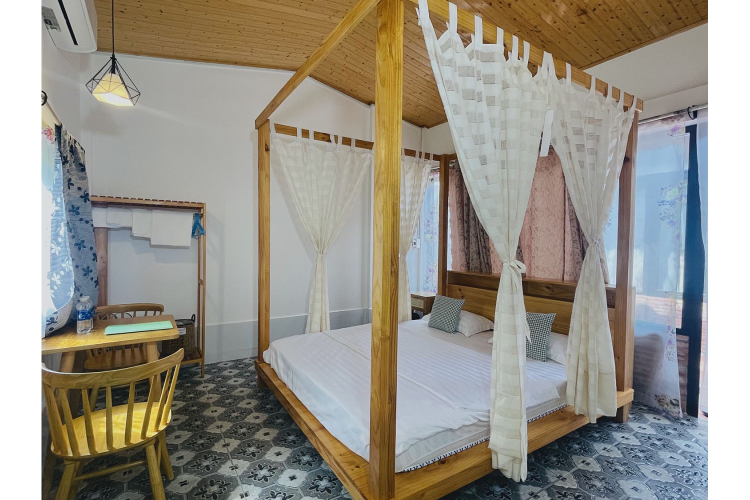 Phòng ngủ: Hành lang ghế gỗ, bàn làm việc, điều hòa, không gian riêng