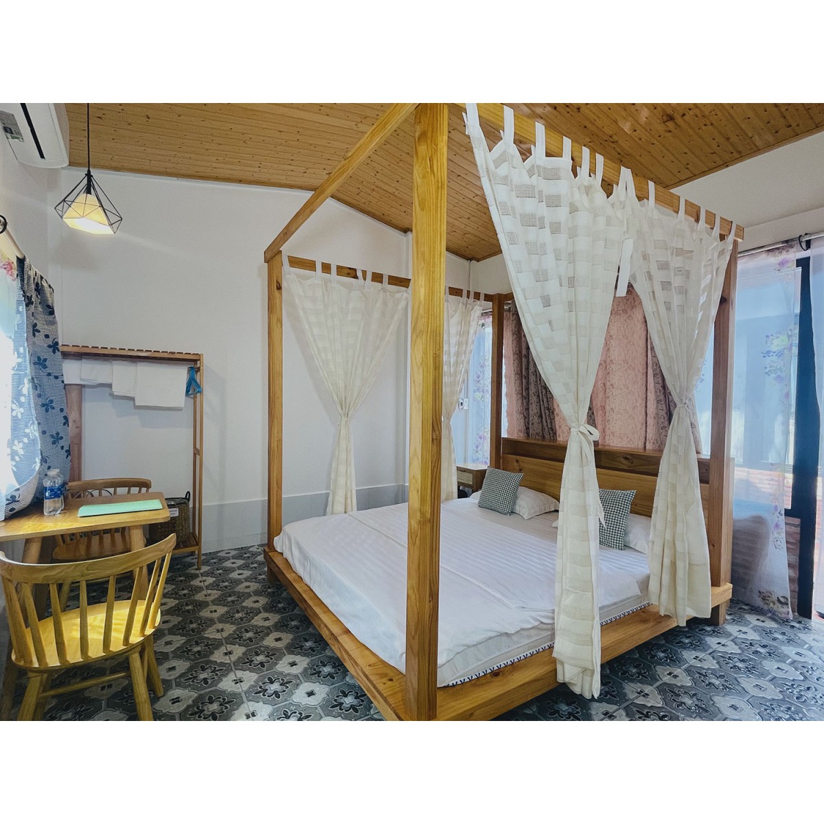 Phòng ngủ: Hành lang ghế gỗ, bàn làm việc, điều hòa, không gian riêng